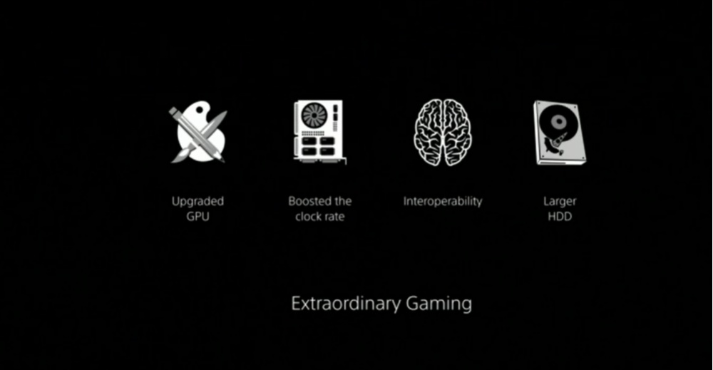 Não foram dados muitos detalhes sobre o hardware incluso no novo console, sendo dito apenas que tanto a GPU quanto a CPU passaram por melhorias para tornar a jogabilidade fluida em taxas de quadro altíssimas mesmo com a resolução Ultra HD. Segundo a Sony, o PS4 Pro será capaz de rodar jogos nesta resolução a 60 fps, o que caso confirmado será realmente um salto e tanto para o que foi encontrado no modelo original. Para acompanhar tudo isto, foi incluído um HD de 1 TB por padrão, não havendo informações sobre versões com maior capacidade de armazenamento nativo.
